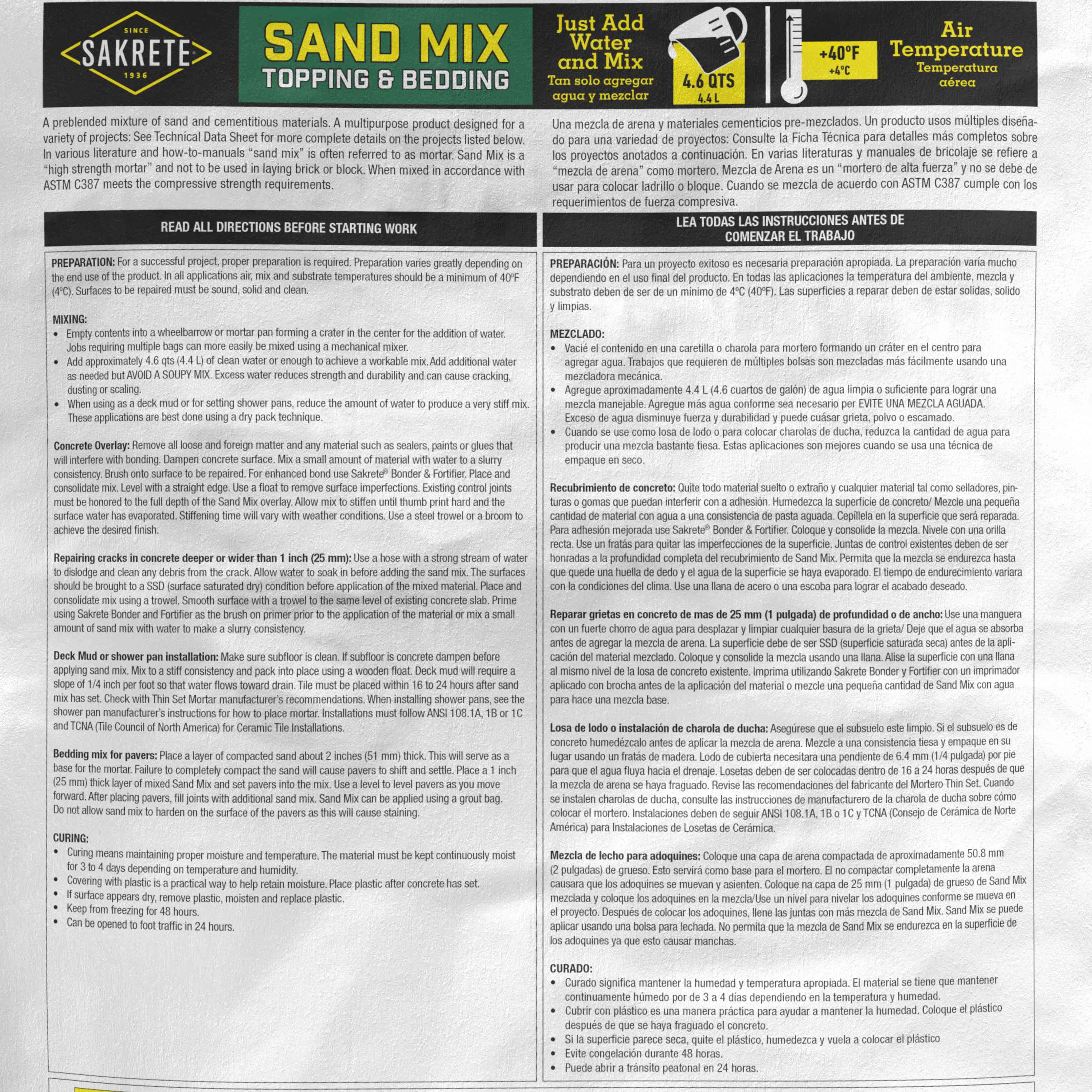 The versatility to tackle more projects with a single mix – that’s Sand Mix. This pro-grade concrete mix is formulated for high strength without large aggregate, making it ideal for use in repairing cracks, slab resurfacing, mortar bedding, forming shower pans, and m